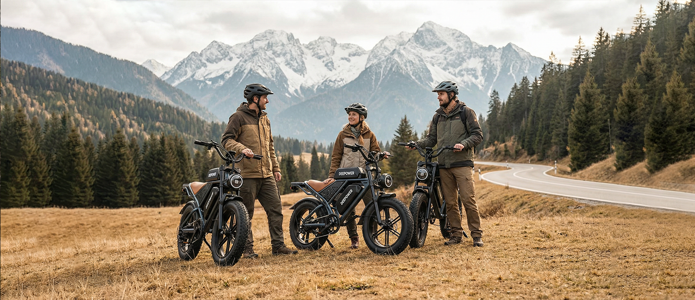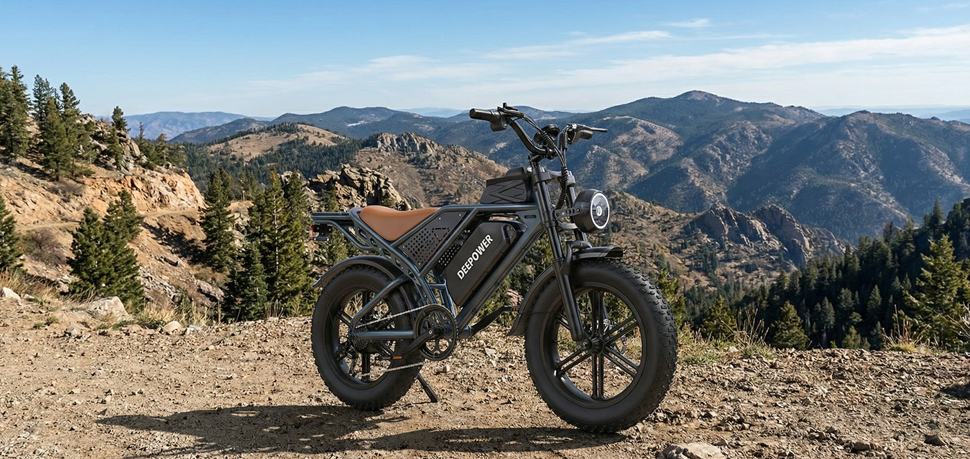 Deepower’s 20"x4" Sunrise puncture-resistant wide tires (deep tread for soft/slippery grip) and front suspension handle flat roads, mountain trails, snow, and gravel with ease—absorbing bumps to deliver a stable, worry-free ride anywhere.
