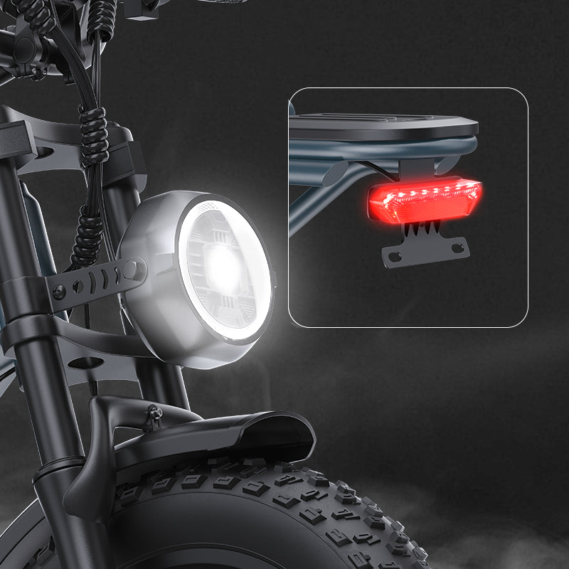Deepower’s headlights feature high-power LEDs (30% brighter than standard, 100ft/30m beam) + built-in horn for convenience. Taillights with red emergency LEDs (turn signals included) stay on at night and flash on braking for enhanced safety.