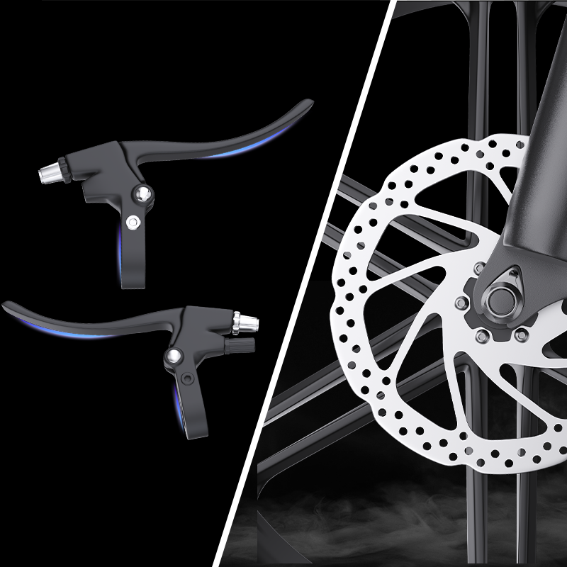 QS7 boasts high-performance mechanical disc brakes (160mm rotors + metal pads) for stable, powerful stopping—even on steep trails or wet roads. Its lightweight frame boosts brake responsiveness for quick, confident stops, while metal pads add durability and cut maintenance.