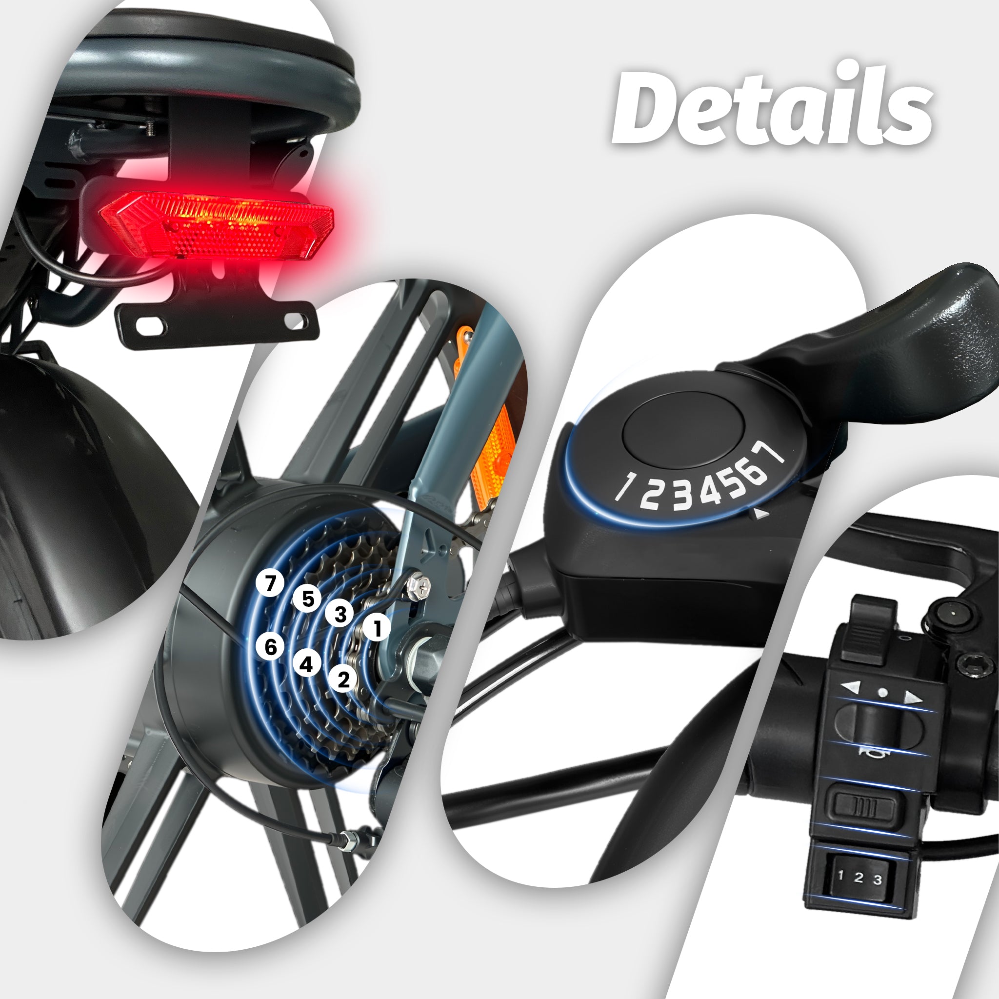 Featuring a Shimano 7-speed freewheel paired with a thumb shifter for effortless gear changes across diverse terrains. Three-speed acceleration settings lets you adjust power instantly—perfect for starts, flats, or climbs