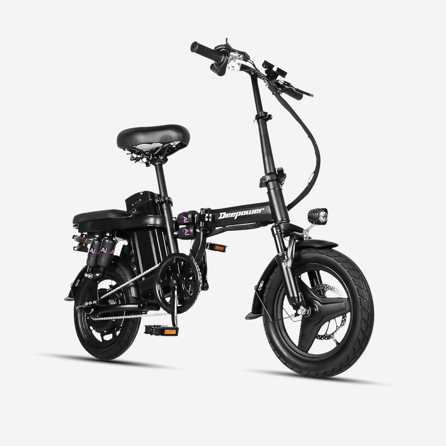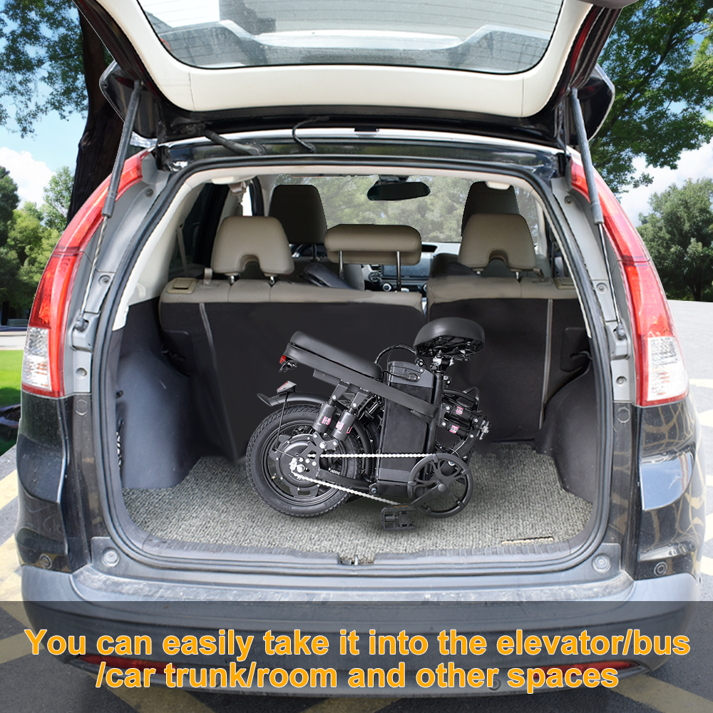 The 14-inch electric bike is foldable! It can easily fit into the trunk of a car, making it perfect for commuting and traveling.