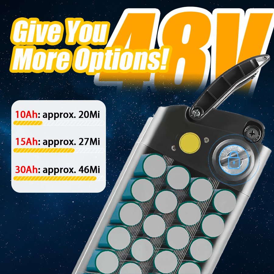 Battery: Removable built-in lithium-ion battery, 48V 10AH (480Wh), 48V 13AH (624Wh), 48V 17.5AH (840Wh), 48V 30AH (1440Wh)