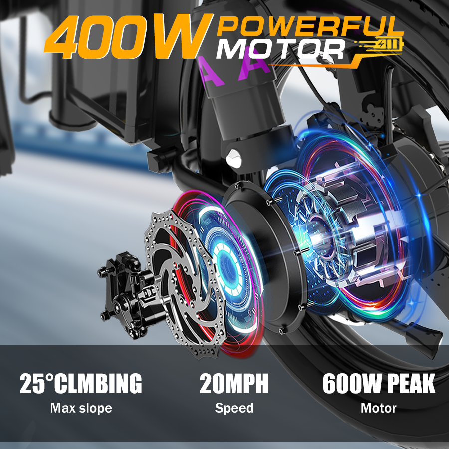 Motor: 600W (peak), 400W (continuous), 48V DC hub motor