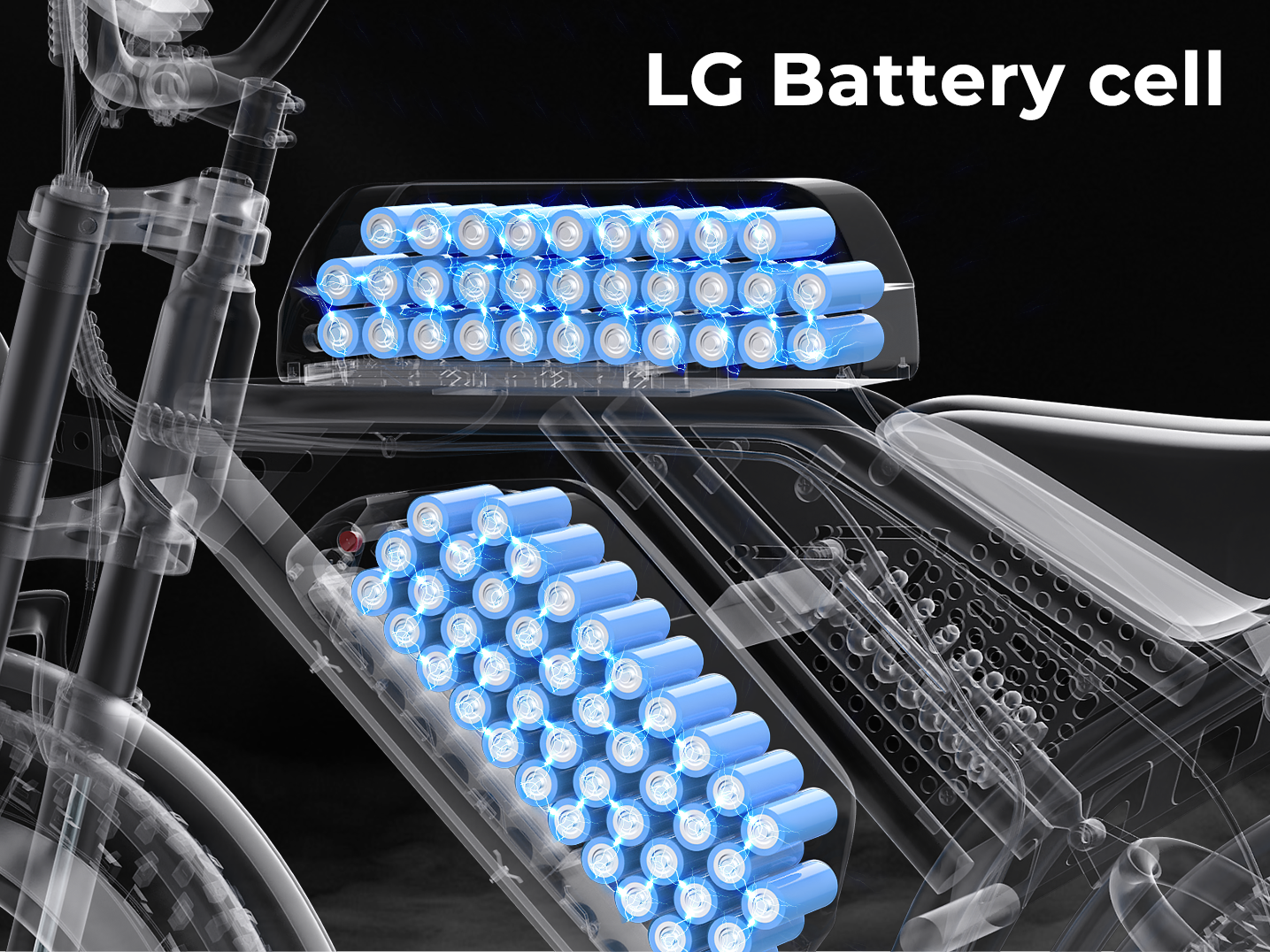 Powered by LG battery cells, the dual-battery setup (48V 25Ah + 35Ah) delivers reliable performance, pushing the maximum range to 185 miles (280km) for long rides without frequent recharging.